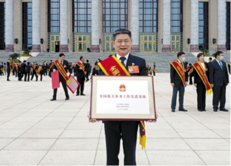 2022年6月27日,市机关事务服务中心主任胡玉林手捧奖牌在人民大会堂前留影。