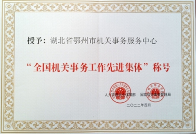 2022年4月,鄂州市机关事务服务中心被人社部、国管局授予“全国机关事务工作先进集体”称号。