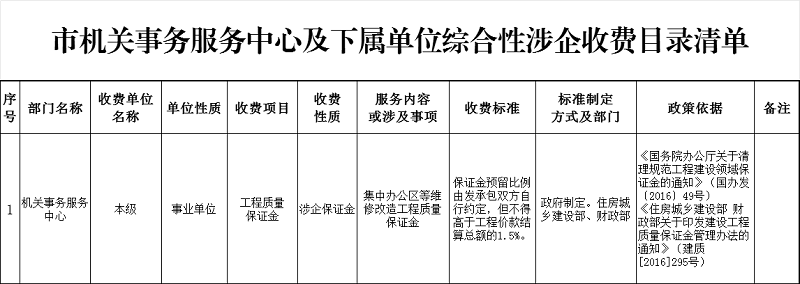 市机关事务服务中心及下属单位综合性涉企收费目录清单