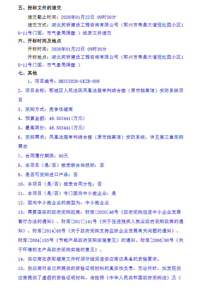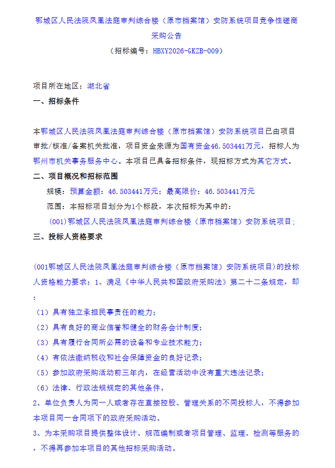 鄂城区人民法院凤凰法庭审判综合楼(原市档案馆)安防系统项目竞争性磋商采购公告