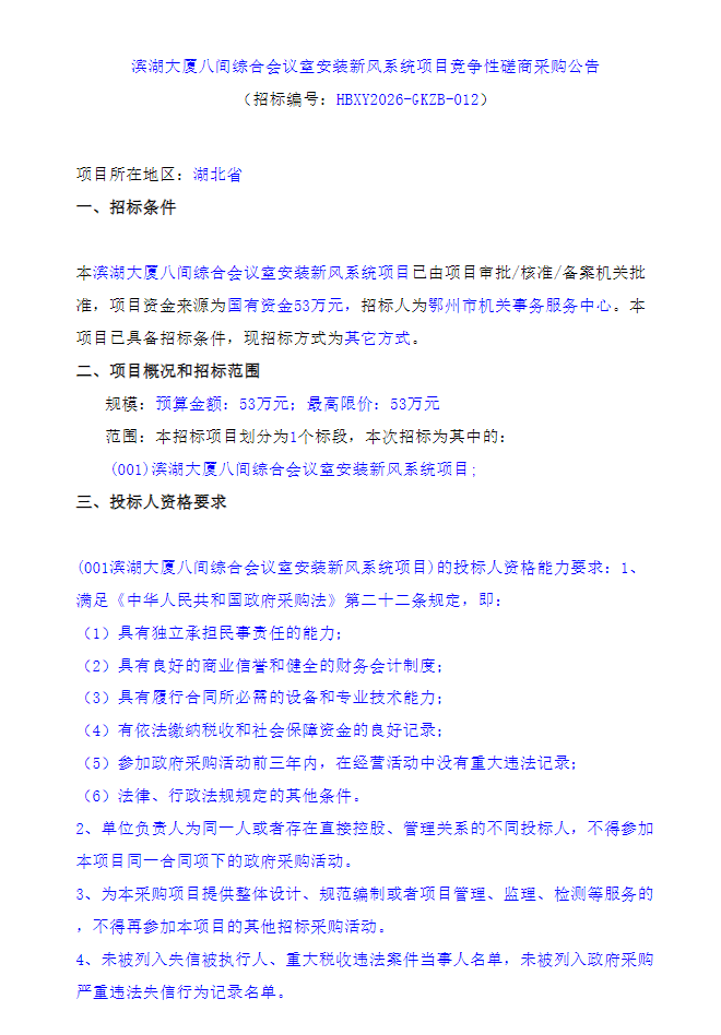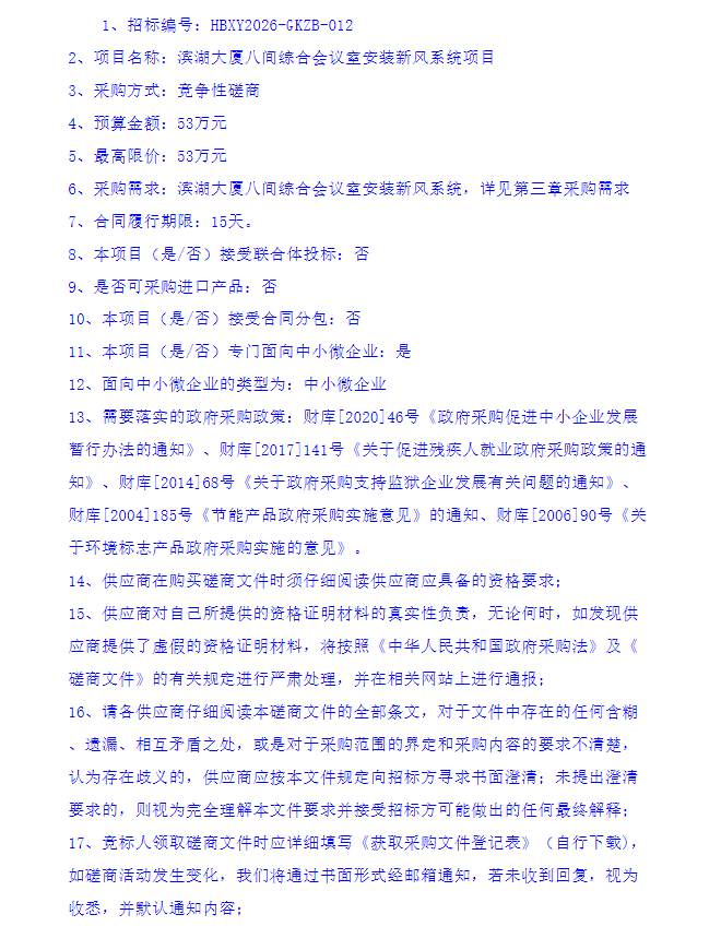 滨湖大厦八间综合会议室安装新风系统项目竞争性磋商采购公告