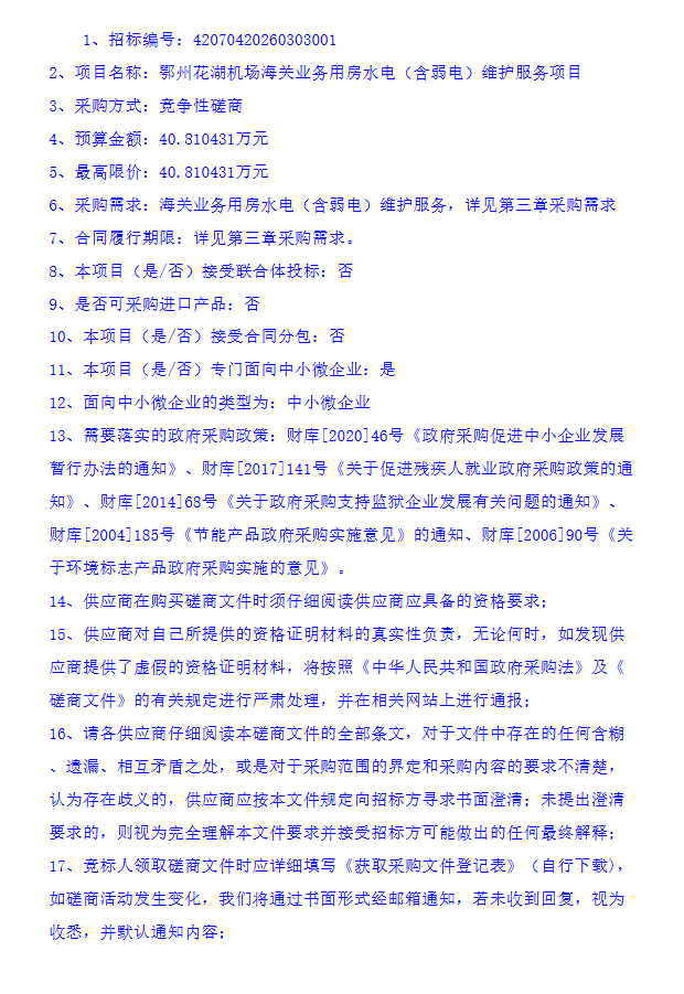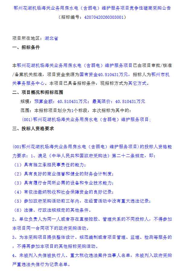 鄂州花湖机场海关业务用房水电(含弱电)维护服务项目竞争性磋商采购公告