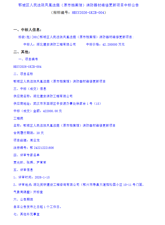 鄂城区人民法院凤凰法庭(原市档案馆)消防器材维修更新项目中标公告